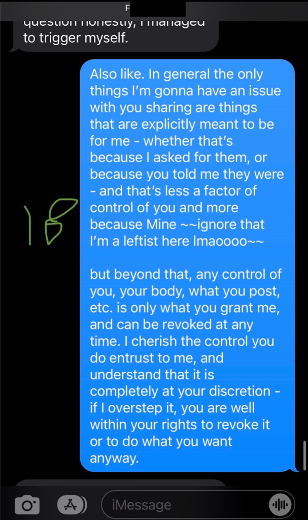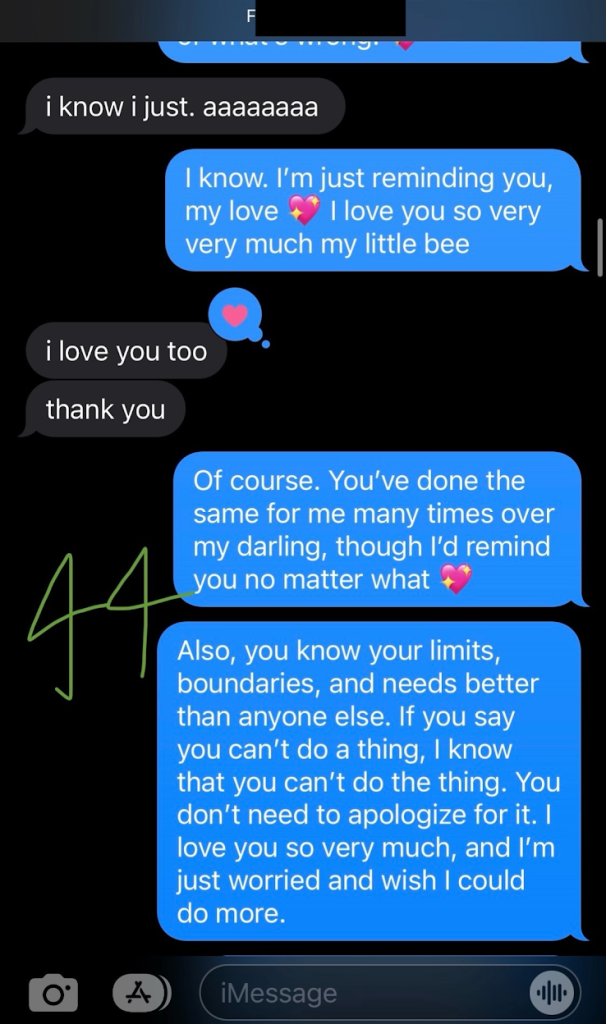 Around this same time, I also had a falling out with one of the local trans community leaders. There wasn’t anything particularly notable about this at the time; it wasn’t a big blow-up, they said they wanted to focus more on their closer friendships at the moment, and I agreed. A couple weeks later I sent a follow-up text, specifically stating that I wasn’t expecting or asking for it to change anything, but wanted to communicate how I was feeling about the initial conversations since we had to continue existing in similar spaces as organizers.