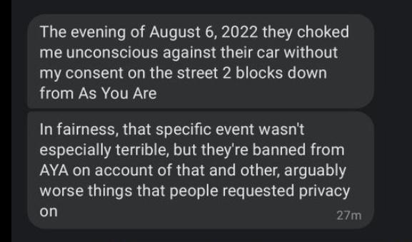 I’m additionally told that multiple people including the owners of As You Are have said they’ve “tried talking to me about it” but the only talks that I’m aware of that have happened, apart from one conversation with the leader I fell out with, were when people I had made out with or messed around with prior came to me and told me they weren’t interested in doing more (whether because they only wanted it to be a one night thing, their situation changed, or other scenarios). In each of those conversations, I had repeatedly reassured the people who came to me that I didn’t have any expectations for them to maintain anything with me, that I was completely fine with us not doing anything else going forward, and thanking them for letting me know their interest had changed so I could adjust appropriately.