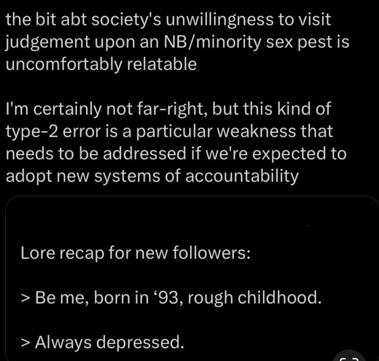 As a Black AMAB, I’ve been falsely accused of sexual assault or consent violations three times in my life. Once pre-transition as a teenager, twice as an adult transfemme. In both of the latter cases, I believed them and was trying to figure out how to change to prevent harming anyone else, until I was given evidence that they were explicitly lying after weeks of only being told vague details of “what I had done”. However, I still don’t have full info on the last incident of what I was actually accused of doing, and likely never will. However, I’m putting forth as much information as I can provide.